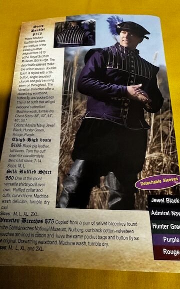 For the look of a Nobleman and comfort of everyday man. This is made of twill, but a suede feel to it. The inside color you can choose the outside is brown as shown. To make it better is also has a twill backing so it gives you two for one if you want to change just flip it and now your a common peasant. This Doublet has its own look to make you stand out . Made of twill wash and line dry.